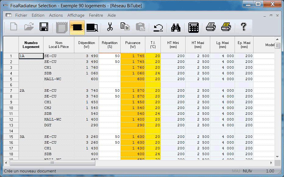 Une fois les radiateurs calculés suivant la loi d'eau choisie par l'utilisateur, FisaRAD produit la famille de radiateurs du projet avec toutes les informations techniques nécessaires :