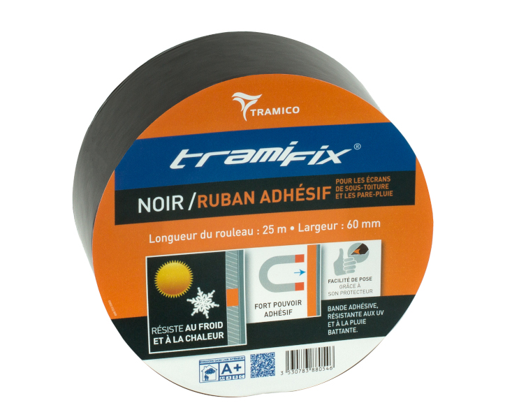 TRAMIFIX NOIR est composé d'un film noir très résistant aux UV et d'un adhésif haute performance. Il convient à l'assemblage étanche extérieur ou intérieur des écrans de sous-toiture et des pare-pluie.